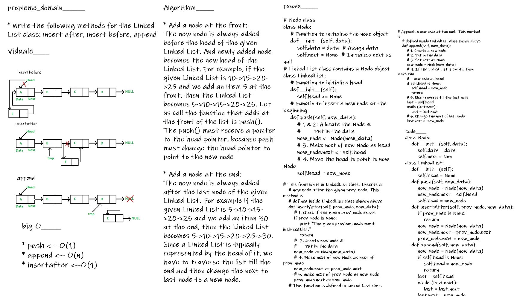 - Can successfully insert a node before a node located i the middle of a linked list