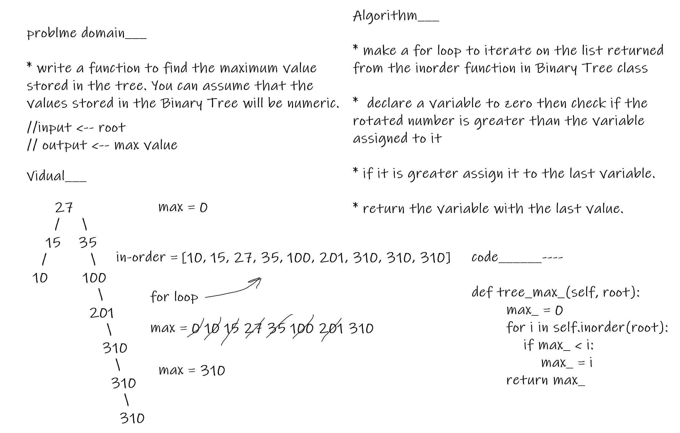 make a for loop to iterate on the list returned from the inorder function in Binary Tree class and declare a variable to zero then check if the rotated number is greater than the variable assigned to it if it is greater assign it to the last variable.