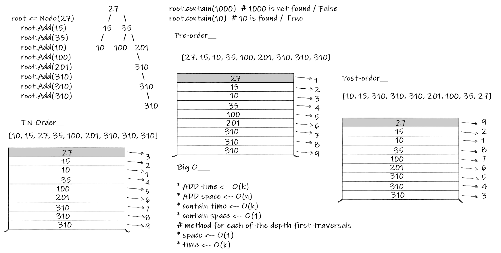 Add Arguments: value Return: nothing Adds a new node with that value in the correct location in the binary search tree. Contains Argument: value Returns: boolean indicating whether or not the value is in the tree at least once.
